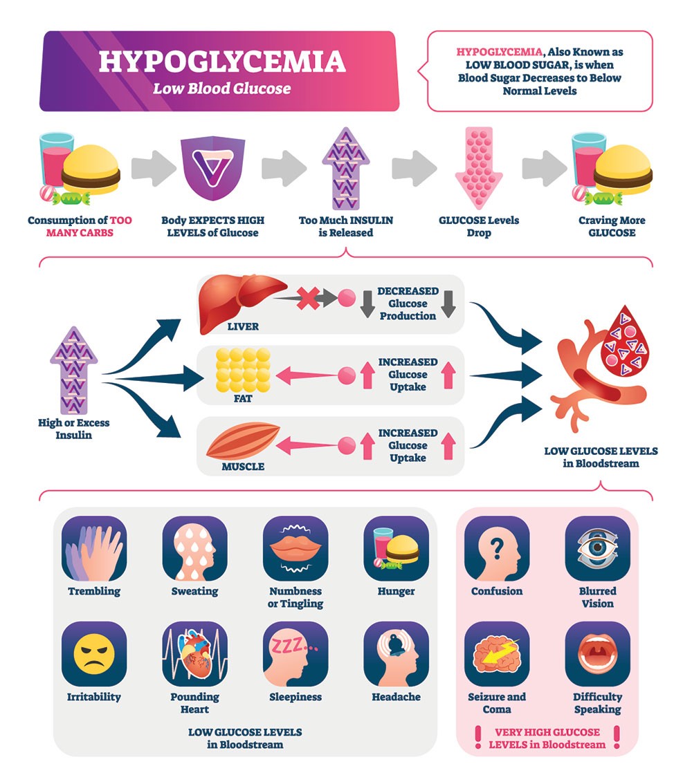 자율신경 증상: 혈당이 낮아지면 인슐린 반대 작용을 하는 호르몬들(글루카곤, 아드레날린, 코티솔 등)이 분비되어서, 심박수 증가, 혈압 상승, 호흡 곤란, 구토, 설사 등의 증상이 나타날 수 있습니다.