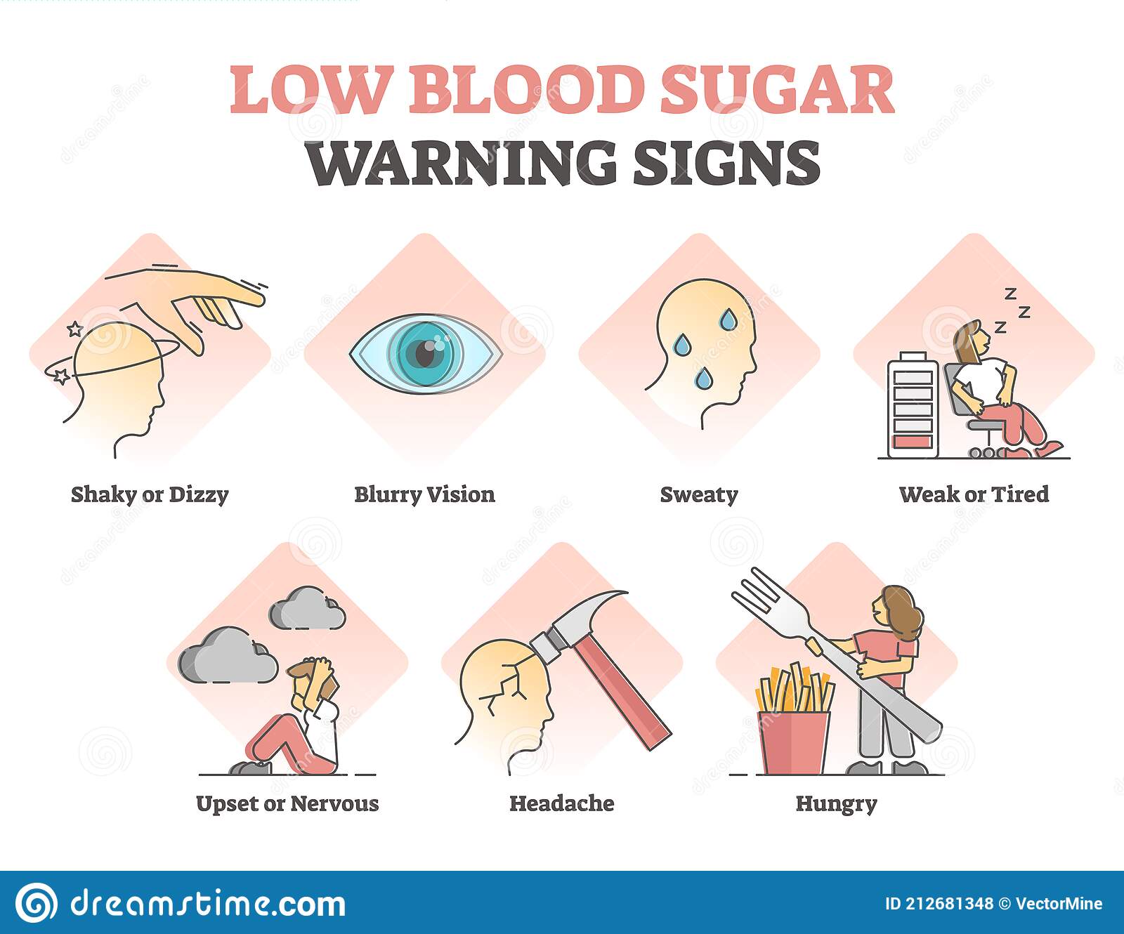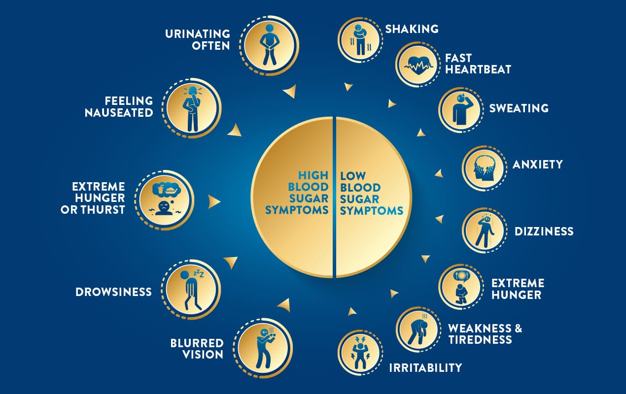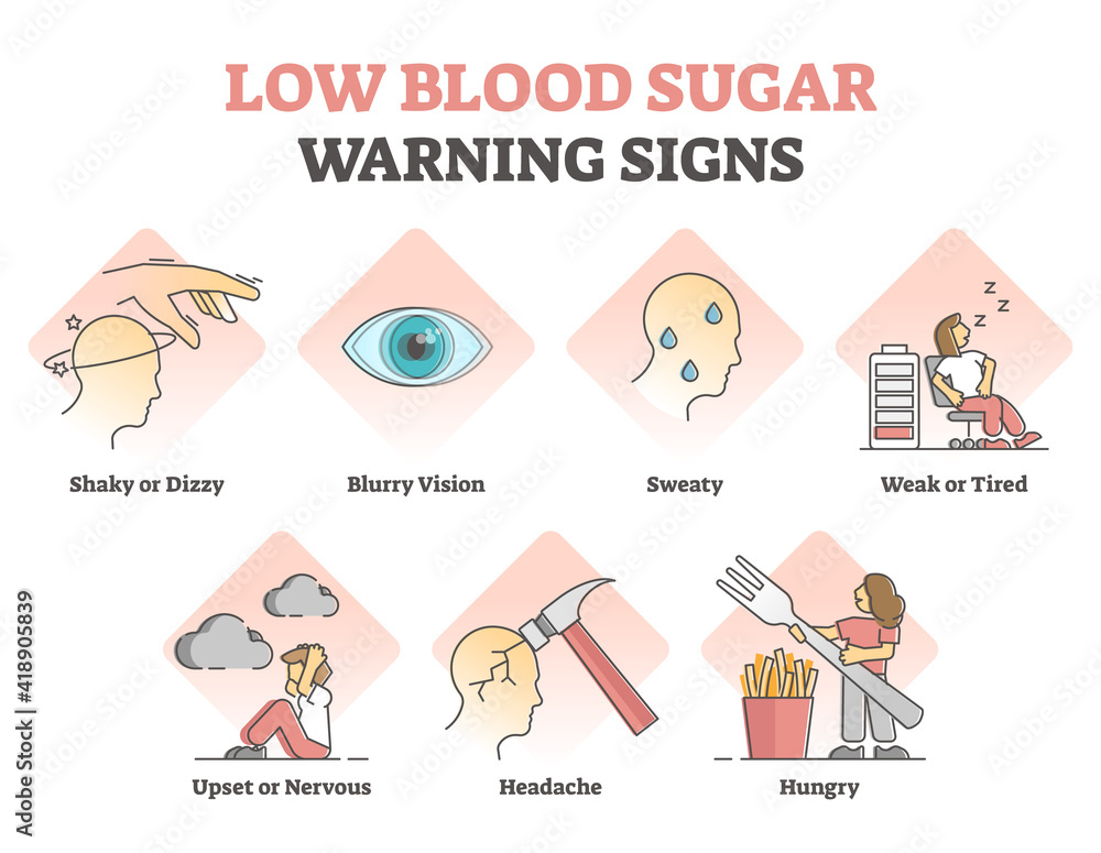 신경학적 증상: 혈당이 낮아지면 뇌에 에너지 공급이 부족해져서, 불안, 떨림, 발한, 땀, 피로, 헤롱거림, 언어장애, 시야장애, 의식 상실 등의 증상이 나타날 수 있습니다. 이러한 증상은 신경계에 영향을 주는 것이므로 신경학적 증상이라고 합니다.